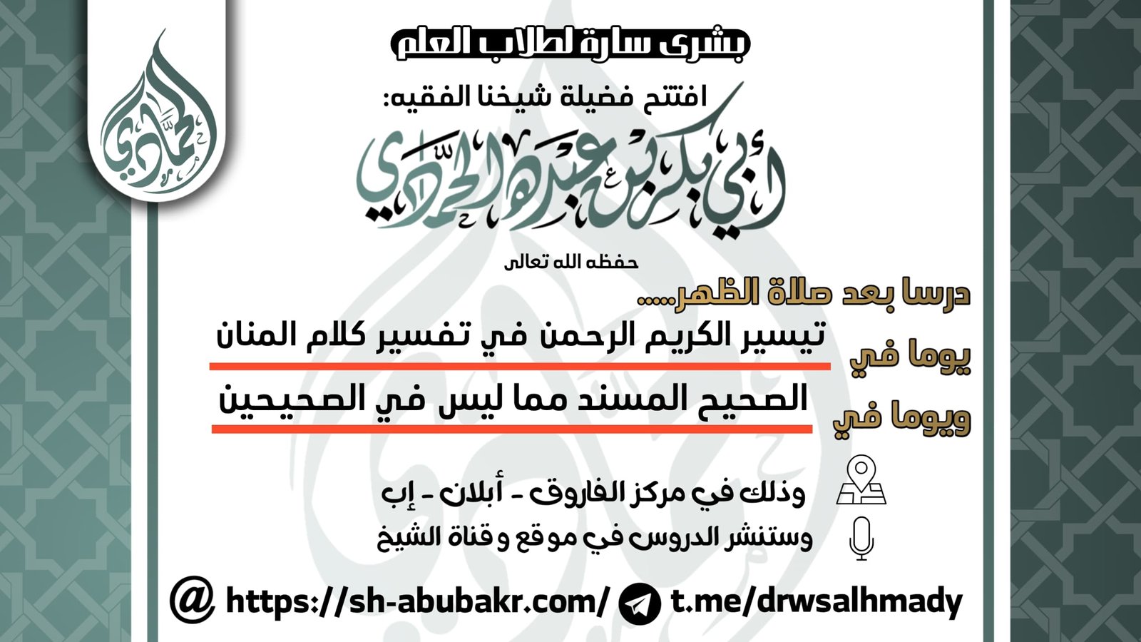 - تقديم الشيخ أبي بكر الحمادي لمحاضرة الشيخ محمد الشرجبي 9 محرم 1447هـ